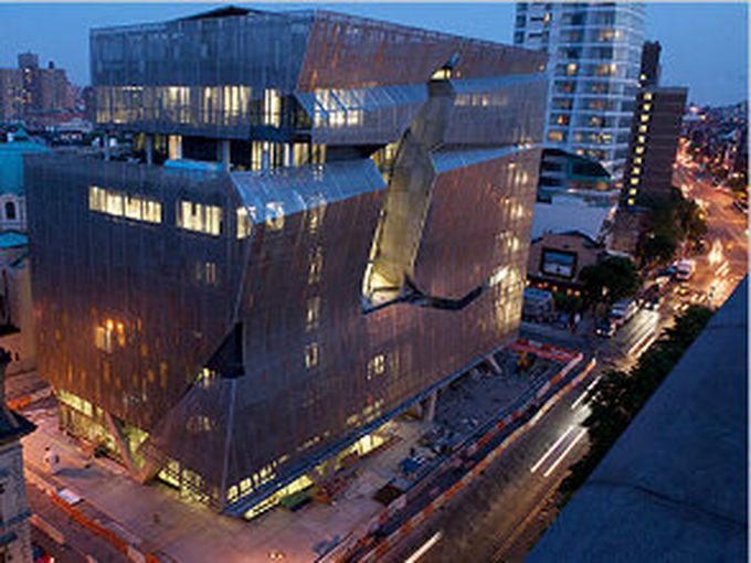 Сградата е покрита с тънък блестящ метал и кара околните къщи да изглеждат като миниатюрни кутийки, но назъбеният й покрив, който плавно се спуска надолу в едната й част, я „приземява” леко.