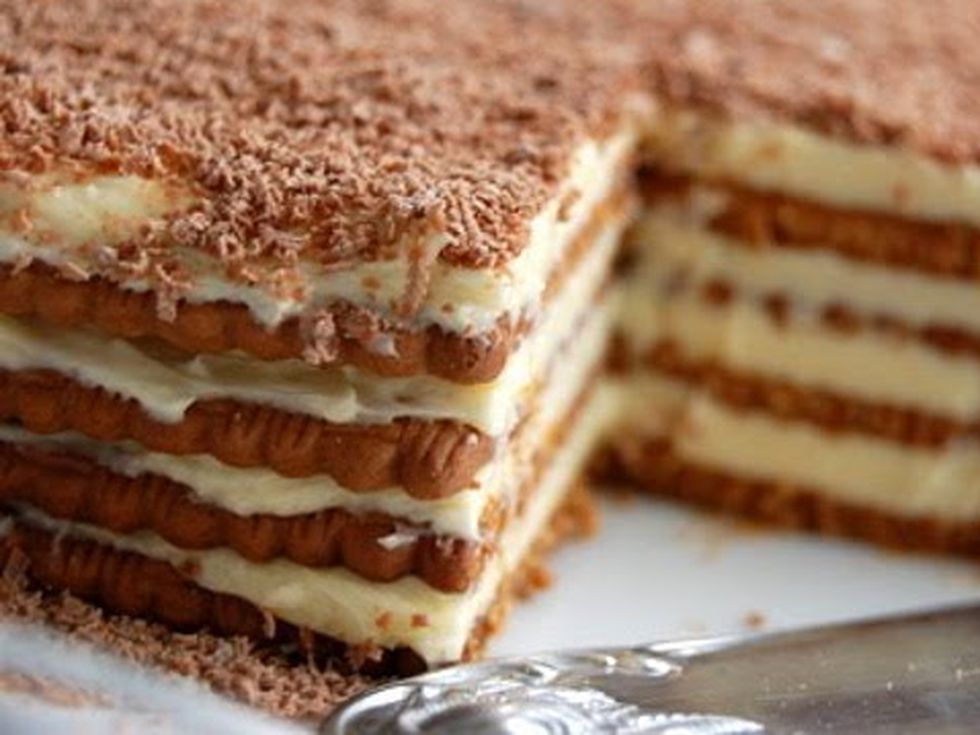 В кутия за сладолед се нареждат ред крем, ред бисквити, заливат се с топинг и реденето продължава, като се свършва със слой крем.