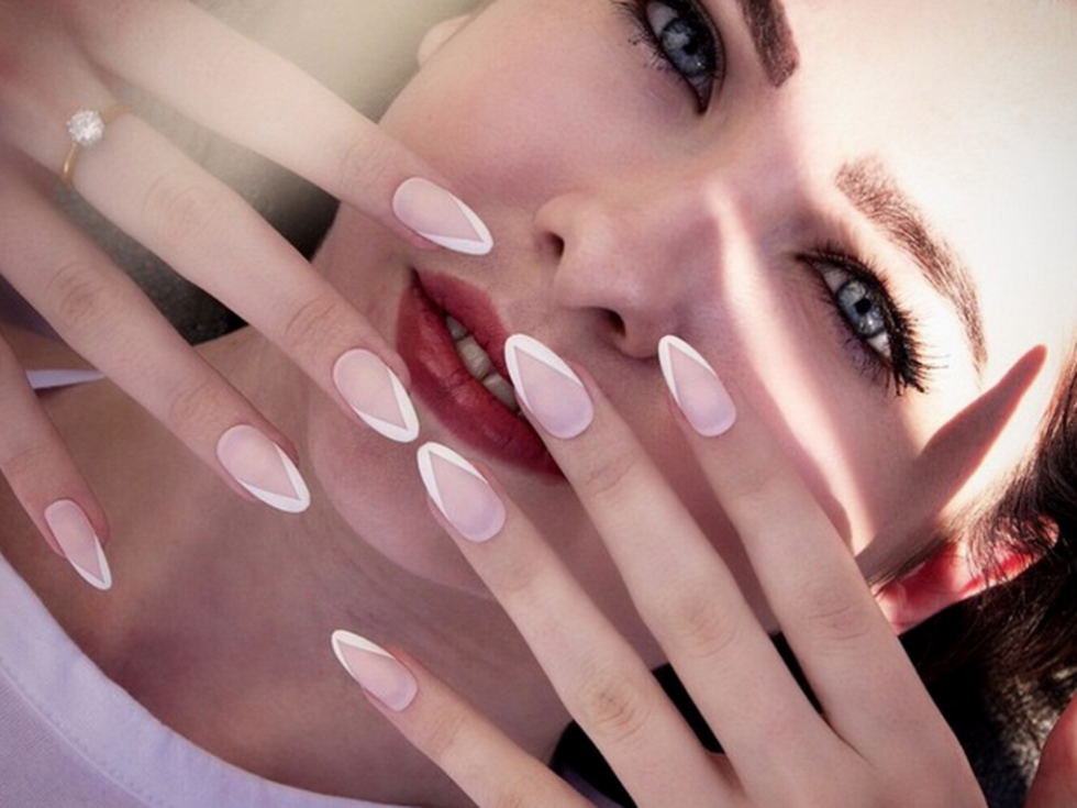 Френският маникюр с триъгълни форми виждаме на нежните ръце на моделката на Victoria's Secret Барбара Палвин.
