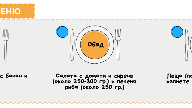 Обяд: Салата с домати и сирене (около 250-300 гр.) и печена риба (около 250 гр.)