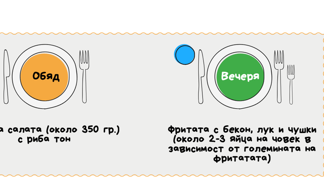 Вечеря: Фритата с бекон, лук и чушки (около 3-4 яйца на човек в зависимост от големината на фритатата)