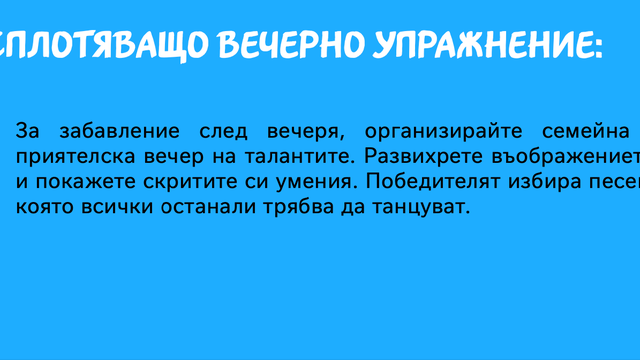 За забавление след вечеря, организирайте семейна или приятелска вечер на талантите. Развихрете въображението си и покажете скритите си умения. Победителят избира песен, на която всички останали трябва да танцуват.