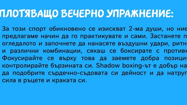 За този спорт обикновено се изискват 2-ма души, но ние ви предлагаме начин да го практикувате и сами. Застанете пред огледалото и започнете да нанасяте въздушни удари, ритници и различни комбинации, сякаш се боксирате с противник. Фокусирайте се върху това да заемете добра позиция и контролирайте бързината си. Shadow boxing-а е добър начин да подобрите сърдечно-съдовата си дейност и да натрупате сила в ръцете и краката си.