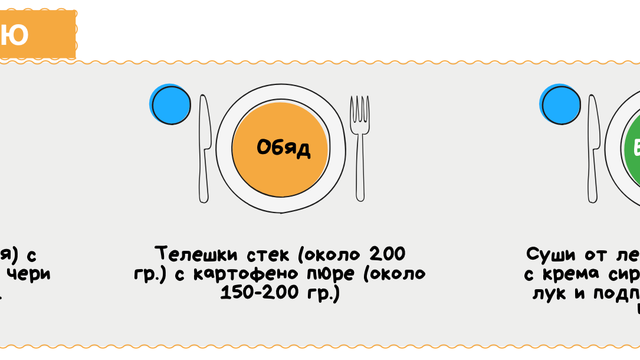 Обяд: Телешки стек (около 200 гр.) с картофено пюре (около 150-200 гр.)