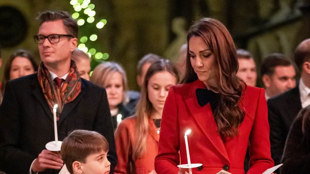 За Коледната си визия Кейт заложи на дълго червено палто с черна панделка и черни копчета.