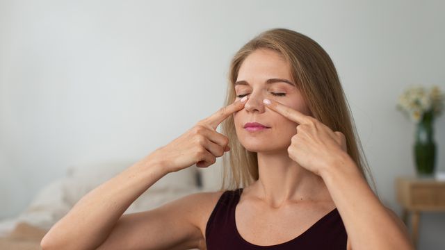 За следващото упражнение е нужно да използвате показалеца и средния пръст, като нежно потупвате около очите с движение навън. Това намалява подпухналостта и съживява уморени очи. Повторете 20 пъти.