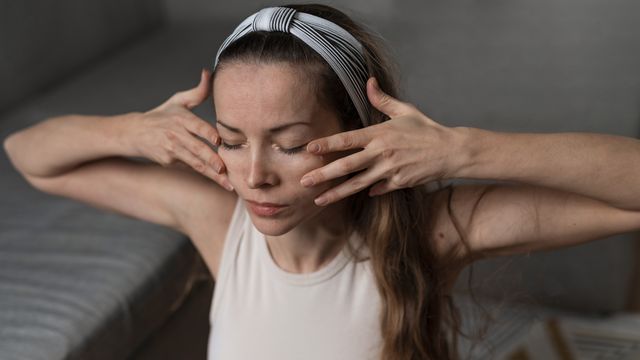 Стиснете юмруци с двете ръце и нежно плъзнете кокалчетата си по челото от центъра навън. Това помага за освобождаване на напрежението и омекотяване на фините гънки. Повторете движението 20 пъти.