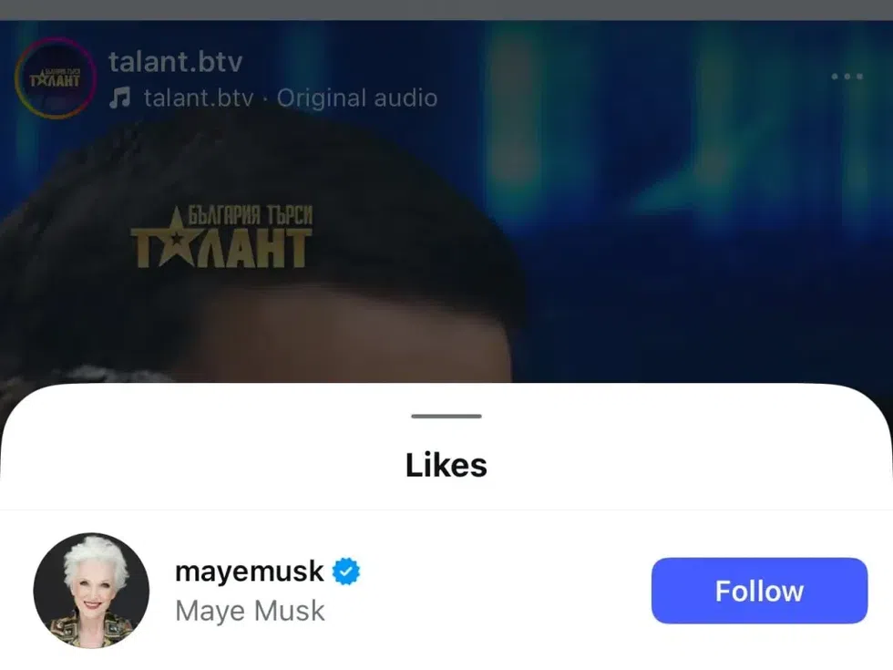 В същото време Мей Мъск, която е вдъхновяваща фигура в света на модата, също е оставила своя лайк под друго видео от формата. Изглежда, че красивото изпълнение на въздушна акробатика на дуо Disar е впечатлило майката на Илон Мъск.