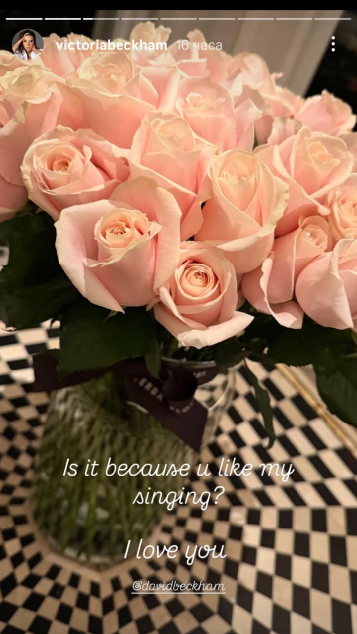 По-късно същата вечер Виктория бе истински развълнувана, когато съпругът ѝ Дейвид я изненада с изящен букет нежнорозови рози. Споделяйки снимка на цветята, Пош написа: "Това, защото харесваш как пея ли? Обичам те, Дейвид Бекъм".