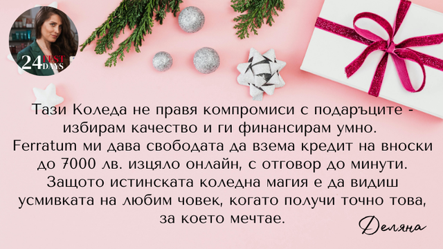 Понякога най-желаните подаръци са извън текущия ни бюджет, особено когато искаме да зарадваме няколко близки души едновременно. Добрата новина е, че има гъвкави начини да превърнем коледните желания в реалност, без да нарушаваме финансовото си равновесие. Кредитът на вноски от Ferratum предлага суми до 7000 лв. със срок до 18 месеца - достатъчно, за да си позволим качествените подаръци, които наистина имат значение и да ги изплатим удобно през следващите месеци. Процесът е изцяло онлайн и разчита на автоматизирани решения - просто избираш необходимата сума, попълваш формата за кандидатстване и получаваш отговор до минути. Без излишни документи, без дълго чакане - само възможността да направиш Коледа наистина специална за хората, които обичаш, без компромис с финансовия си комфорт.