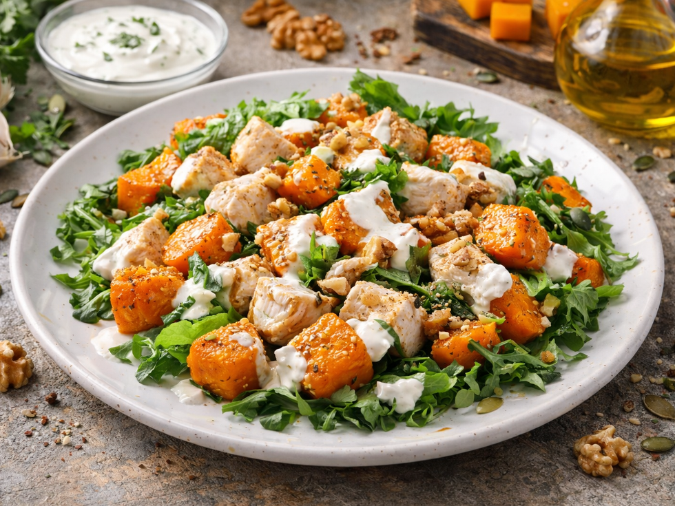 Тази салата съчетава нежно пилешко месо със сладостта на печената тиква и свежестта на лек млечен дресинг – идеален баланс за зимния сезон.