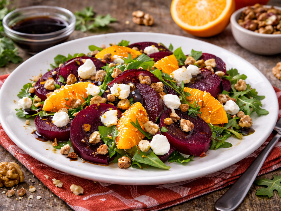 Цвеклото се нарязва на тънки резени, портокалът се обелва и разделя на филета. Подреждат се върху руколата, добавя се натрошеното сирене и орехите. Овкусява се със зехтин и няколко капки балсамов оцет.