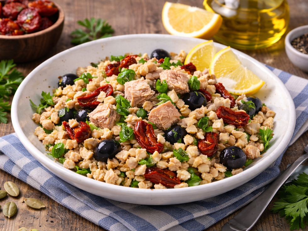 Средиземноморска салата с перлен ечемик, риба тон и сушени домати