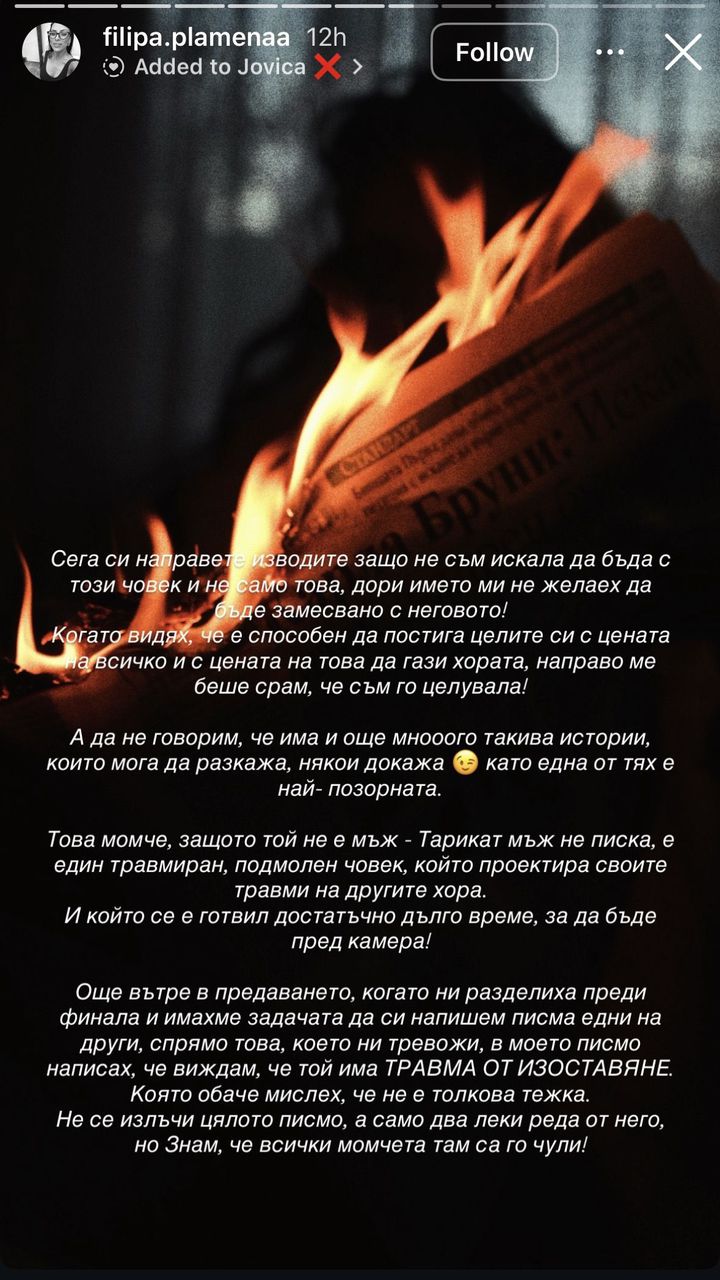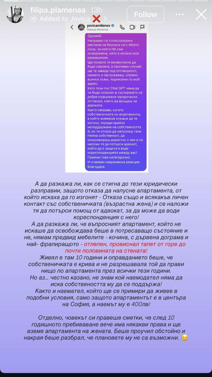 Филипа добави и скрийншоти от чатове с други момичета, които познават Йовица преди влизането му в „Ергенът: Любов в рая“, в които коментират, че е плейбой, използва приложения за запознанства, а на момичетата казва, че не търси сериозна връзка.