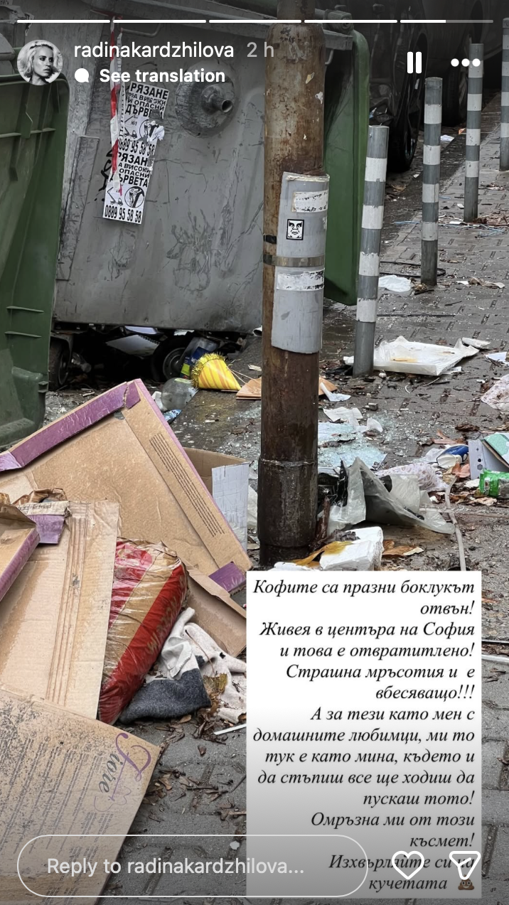 „Кофите са празни боклукът отвън! Живея в центъра на София и това е отвратително! Страшна мръсотия и е вбесяващо!!! А за тези като мен с домашните любимци, ми то тук е като мина, където и да стъпиш все ще ходиш да пускаш тото! Омръзна ми от този късмет!“, написа тя под снимката.