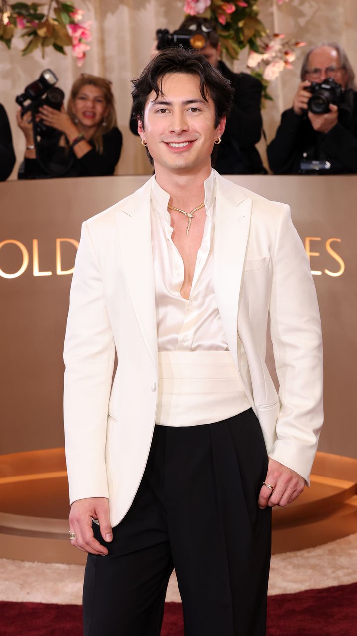 Посланието беше ясно: Heated Rivalry може да е за спорт, но звездите му вече играят съвсем различна модна игра. Уилямс представи един от най-сдържано въздействащите мъжки модни моменти на вечерта. Облечен в изчистено сако в цвят айвъри, комбинирано с ефирна бяла риза на Giorgio Armani, умишлено разкопчана (може би в чест на най-запалените му фенове), и скулптурен пояс тип кумербунд, който подчертаваше талията и преминаваше в елегантно скроени черни панталони, той балансира визията с класическа официална основа.
