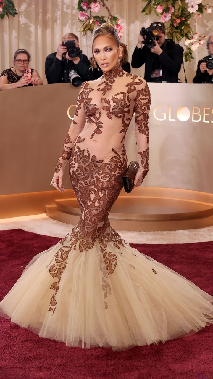 Дженифър Лорънс доказва, че тенденцията на „голата“ рокля няма намерение да си отива с персонализирана рокля на Givenchy. Творението на Сара Бъртън безапелационно следваше естетиката на „голата“ визия: прозрачна, прилепнала към тялото силуетна линия, богато бродирана с фини флорални мотиви, които очертаваха формите, без да ги натрапват. Равни части романтика и дързост, прозрачният дизайн постигна уверен баланс между нежност и сексапил — на светлинни години от обемните бални рокли, които някога определяха образа ѝ на червения килим.