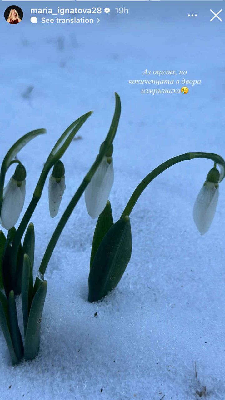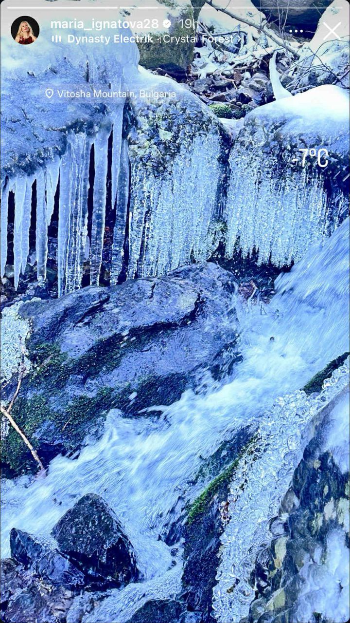 На още снимки в сторитата пък тя е намерила красиви кокичета, които се подават от снега. А на друга снимка показва полузамръзналата река.