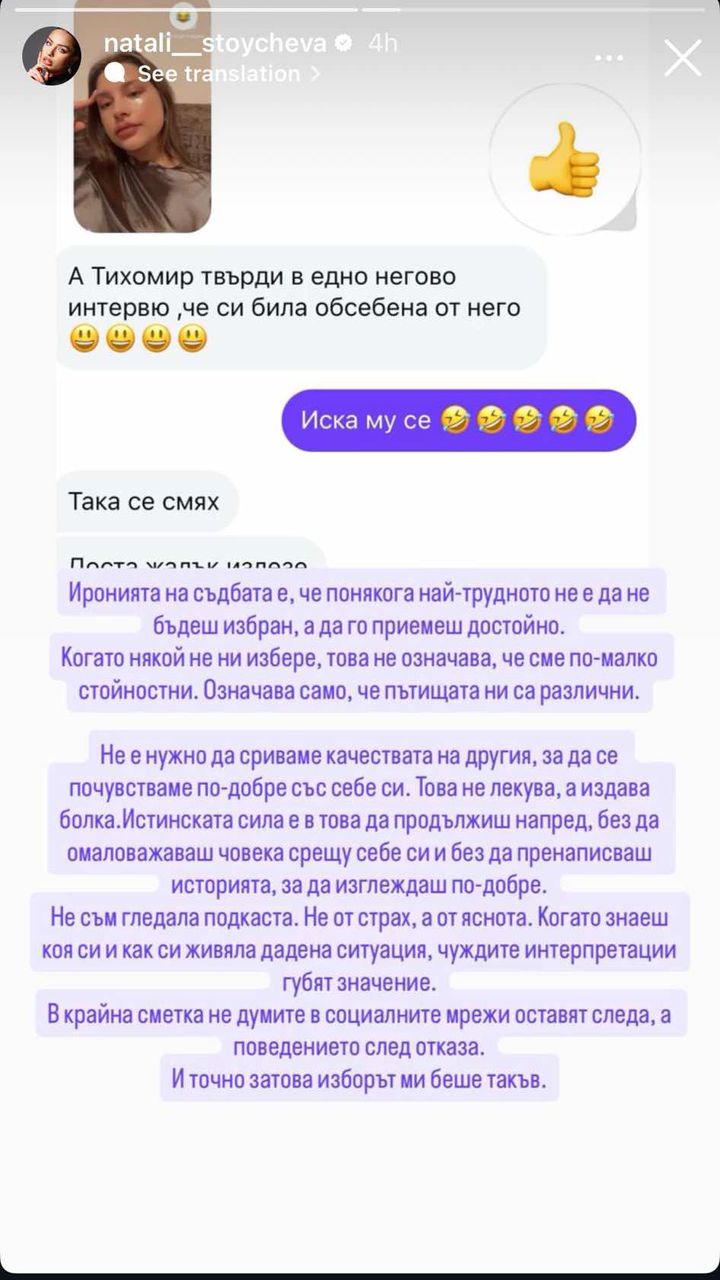 Върху скрийншота Натали пояснява, че е важно, когато някой не ни избира, да го приемем с достойнство. А не да пренаписва историята, за да изглежда по-добре в нея.