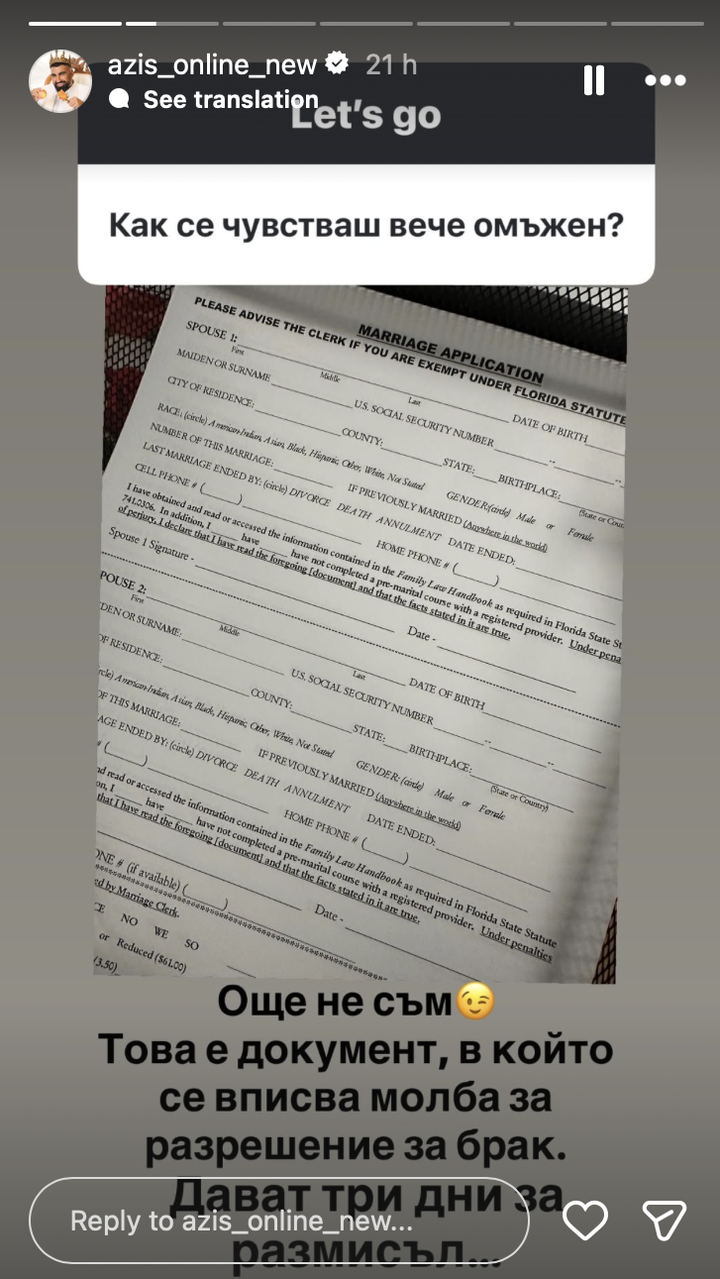Попфолк звездата Азис показа подготовката си за сключване на брак в САЩ, показвайки необходимите за целта документи, пише hotnews.bg. Преди около десет дни Васил Боянов, както е истинското име на певеца, изненада своите последователи с новината, че ще се жени.