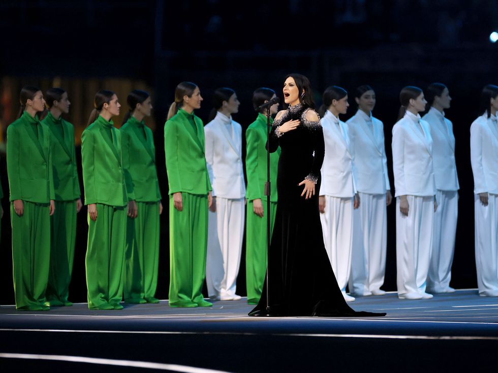 Друга италианска звезда, носителката на четири награди „Грами“ Лаура Паузини, изпълни националния химн, облечена в елегантна рокля, дело на Джорджо Армани.