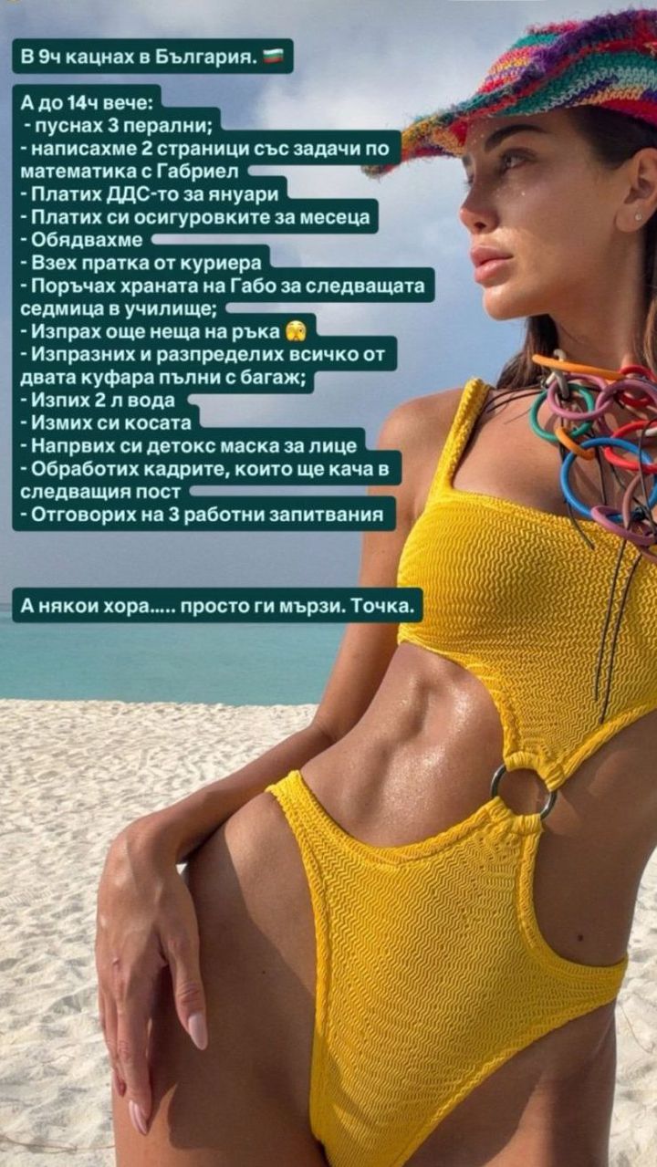 В социалните мрежи тя подробно изброи всичко, което е успяла да направи: пуснала три перални, написала две страници по математика със сина си Габриел, платила ДДС за януари и месечните осигуровки, обядвала, взела пратка от куриер, поръчала храна за училище за следващата седмица, изпрала дрехи на ръка, разопаковала два куфара, изпила два литра вода, измила косата си, направила детокс маска за лице, обработила снимки за нов пост и отговорила на три работни запитвания.