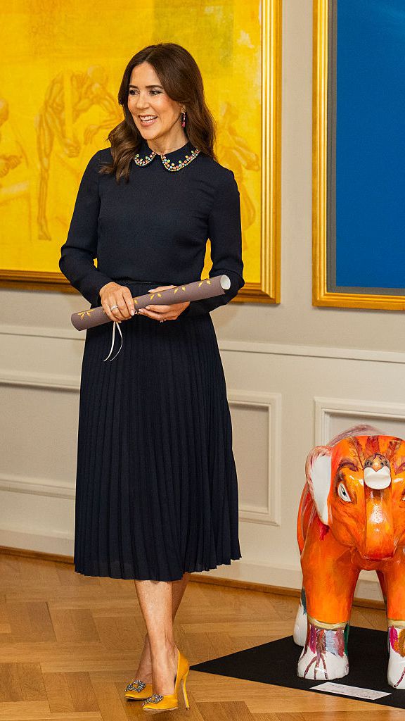 За повода кралица Мери избра плисирана миди рокля от креп на Valentino, чиято яка беше украсена с кристали.