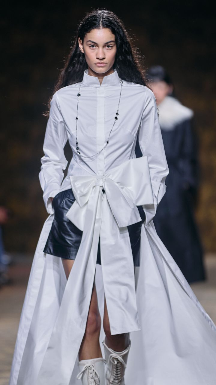 Saint Laurent се движеше в същата, но по-спокойна посока, тук видяхме ниска талия, полупрозрачни тъкани с елементи от кринолин и многослойна дантела. Тенденциите за есен 2026 очевидно реабилитират естетиката отпреди две десетилетия.