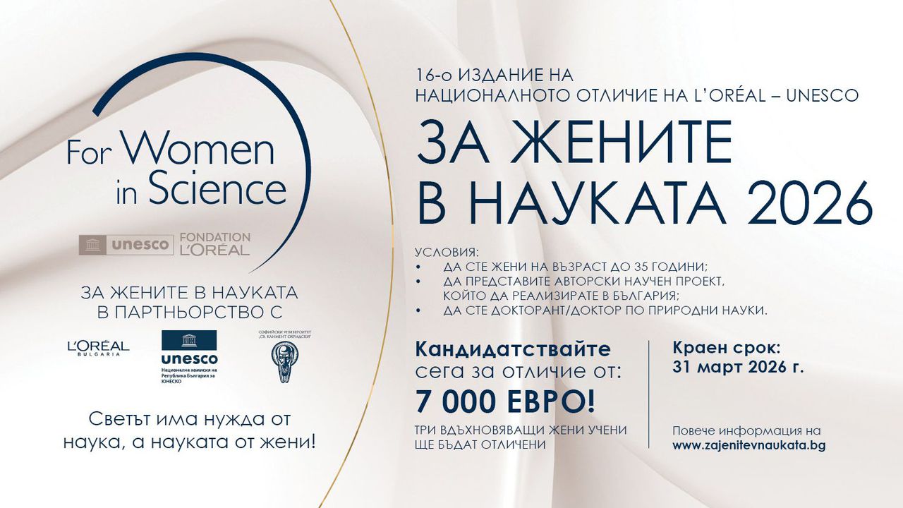 Само 20 дни остават до крайния срок за кандидатстване за националните отличия „За жените в науката“, които ще подкрепят три млади български изследователки с по 7000 евро за развитието на техните научни проекти. Кандидатури се приемат до 31 март 2026 г., а конкурсът е отворен за жени учени до 35 години, които са докторанти или вече имат защитена докторска степен и работят по изследвания в областта на природните науки.