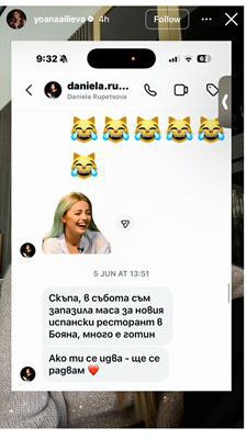 Илиева допълни, че през последните месеци Рупецова многократно се е опитвала да установи контакт с нея. Освен че ѝ е звъняла и писала, Даниела я е молила за контактите на нейния PR и дори я е канила на обяд. „Скъпа, в събота съм запазила маса за новия испански ресторант в Бояна, много е готин. Ако ти се идва – ще се радвам“, се казва в едно от съобщенията, изпратени от Рупецова.