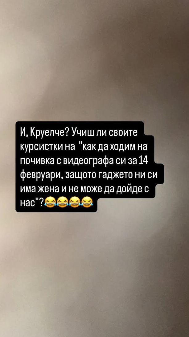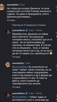 Според 21-годишната инфлуенсърка именно Даниела стои зад анонимния акаунт. Като доказателство тя посочва, че профилът има само деветима последователи, сред които са сестрата на Рупецова и бившият ѝ приятел Николай. „Под публикацията ми се появиха обвинения, че копирам Даниела Рупецова. Нека започна оттам, че видеото, за което става дума, е световен тренд и се използва от множество създатели на съдържание. Второ – нямам никаква причина да копирам въпросната Даниела, защото за мен тя не е нито пример, нито ми е ориентир. Към този момент, и не само, ми е напълно безразлична“, коментира Йоана.