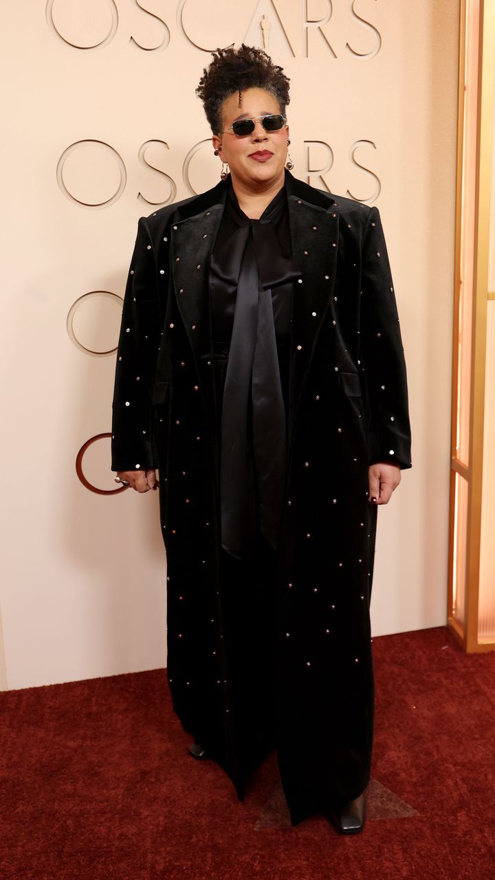 Деловият стил изглежда беше водеща тема на вечерта! Музикантката Британи Хауърд пристигна, облечена в тренчкот, инкрустиран с кристали, съчетан с черен костюм и висящи обеци.
