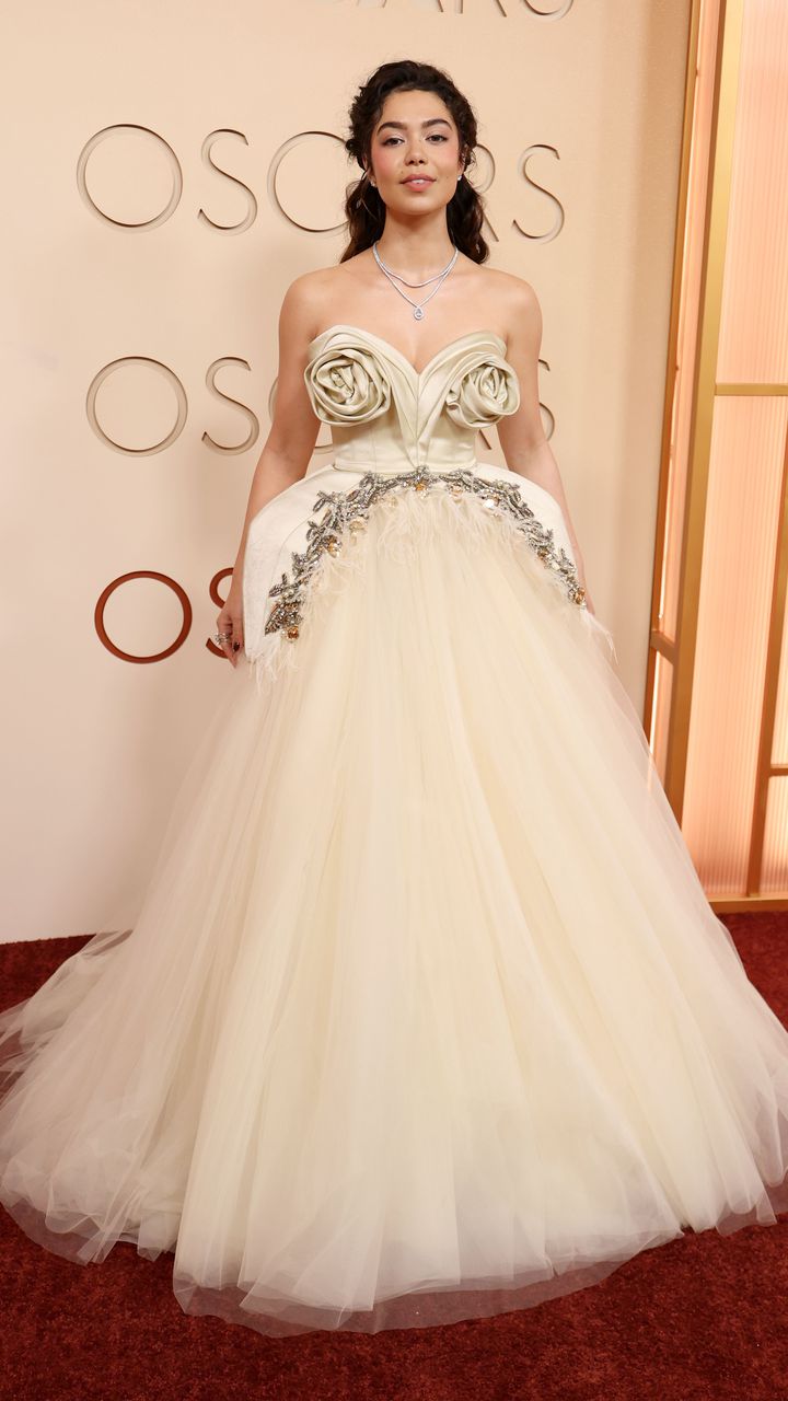 Актрисата Аули'и Кравальо изглеждаше сякаш отива на Met Gala, а не на Оскарите. Тя носеше рокля без презрамки в кремав цвят с огромна пола от тюл. Горната част включваше две огромни, скулптурирани рози на бюста, а визията беше завършена с две диамантени колиета.
