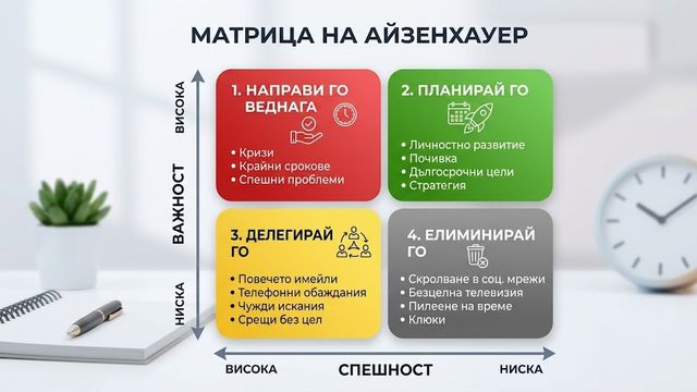 Често се чувстваме претоварени не защото имаме твърде много работа, а защото не знаем откъде да започнем. Тази матрица разделя задачите ни в четири квадранта, за да ни върне контрола над деня: