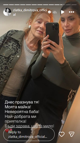 По случай празника Златка сподели мила снимка с Маргарита и написа прекрасно послание. От дъщеря към мама - изпълнено с благодарност и радост. От кадъра се вижа, че Маргарита изглежда чудесно и определено е в крак с модата. Поддържана жена, която стои гордо до порасналото си момиче. А ето и как я поздрави Златка: