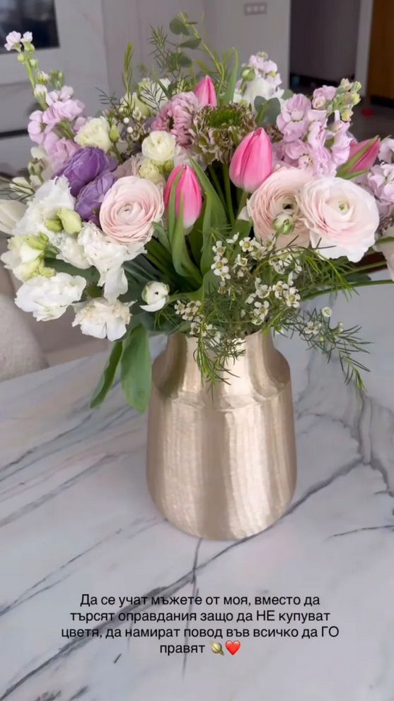 Бившата партньорка на Мартин Елвиса сподели в социалните мрежи кадър на пищен букет от пролетни цветя. Снимката беше придружена от послание, насочено към мъжката аудитория, в което тя изтъква качествата на своя партньор.