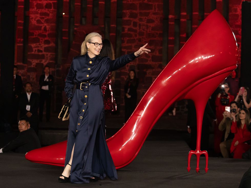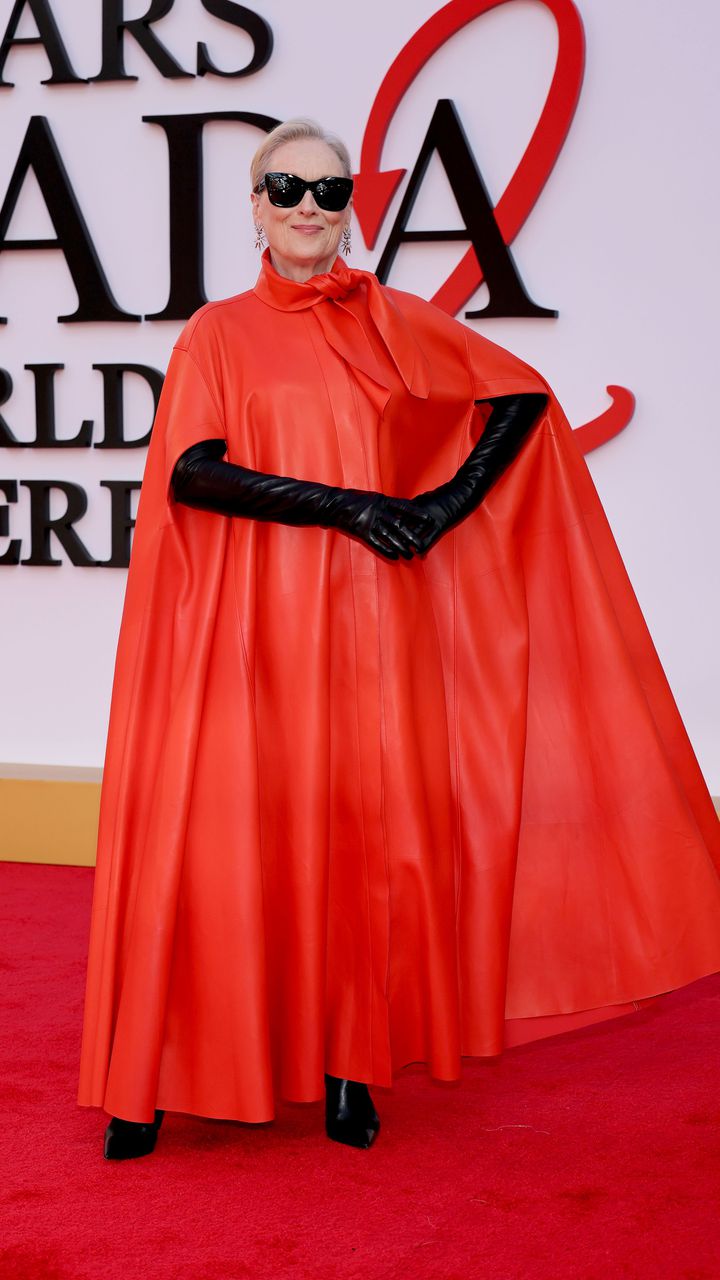 Мерил Стрийп, която отново влиза в образа на страховитата главна редакторка на „Рънуей“ Миранда Пристли, внесе драматизъм с яркочервена рокля тип пелерина, черни ръкавици и характерните за героинята ѝ слънчеви очила.