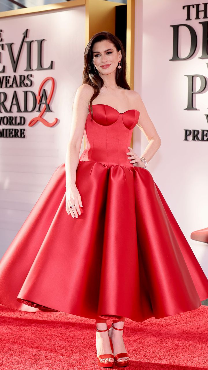 На премиерната прожекция на Ню Йорк в понеделник Ан Хатауей, изпълняваща главната героиня в лентата, демонстрира изключително бляскава визия на червения килим. Актрисата, която е на 43 години, събра погледите в зашеметяваща червена рокля без презрамки на Louis Vuitton, която включваше бюстие и разкроена плисирана пола.